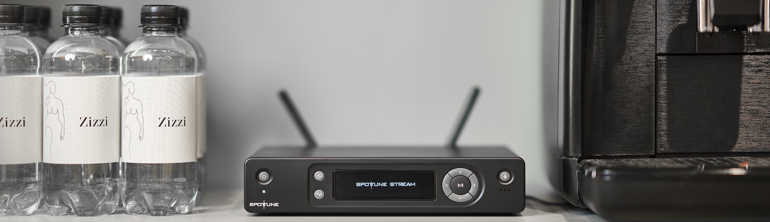 The function of Spottune’s wireless audio transmitter is to wirelessly stream audio to all speakers via the internet. Audio can be played from AUX, USB, and Microphone sources. The device can be controlled manually, through the Spottune App, or online via the Spottune Cloud system. In conjunction with the speakers, it creates a stable wireless sound that is resistant to Wi-Fi interference.